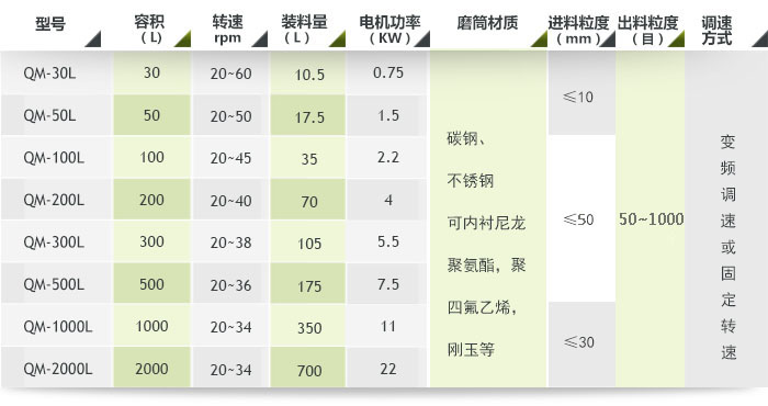 1. 型號說明:QM-(體積)-(A調速型,B普通型) 如:QM-50-A 為50L調速型輥筒球磨機;